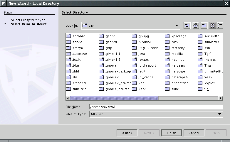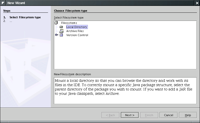 Back in NetBeans, select the menu command File->Mount File System. In the resulting file dialog, select Local Directory.