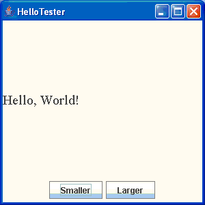 All problems in this lab are based on the HelloTester program: import javax.swing.JFrame; public class HelloTester { public static void main(String args[]) { JFrame frame = new HelloFrame(); frame.setDefaultCloseOperation(JFrame.EXIT_ON_CLOSE); frame.setTitle("HelloTester"); frame.setVisible(true); } } /** File HelloFrame.java */ import javax.swing.JFrame; import javax.swing.JLabel; import java.awt.BorderLayout; import java.awt.Font; public class HelloFrame extends JFrame { public HelloFrame() { message = "Hello, World!"; label = new JLabel(message); label.setFont(new Font("serif", Font.PLAIN, DEFAULT_SIZE)); add(label, BorderLayout.CENTER); setSize(FRAME_WIDTH, FRAME_HEIGHT);} private String message;private JLabel label; private static int FRAME_WIDTH = 300;private static int FRAME_HEIGHT = 300; private static int DEFAULT_SIZE = 20; } In this problem, you need to add two buttons to the bottom of the frame, like this: Follow these steps: 1. Make two instance variables of the class JButton: private JButton smallerButton;private JButton largerButton; 2. Create a method called createSouthPanel and place the following two lines inside the method to initialize the variables with JButton objects: smallerButton = new JButton("Smaller");largerButton = new JButton("Larger"); 3. Place the buttons into a panel: JPanel southPanel = new JPanel();southPanel.add(smallerButton); southPanel.add(largerButton);