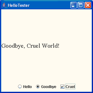 Add the two radio buttons to the frame of the HelloTester program. Add a createSouthPanel method, just like you did in the previous problems. (a) What is the code for your HelloFrame class? (b) Run the program. What happens when you click the radio buttons? |