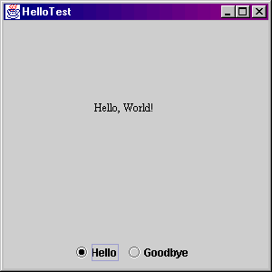 Note that you can attach the same action object to both buttons. Add the action listener and attach it to the radio buttons. Run the program. Observe how clicking the buttons changes the message text. What is the complete source code for your HelloFrame class? |