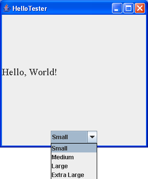 Try it out. Add the combo box to the frame of the HelloTester program. Compile and run the program. Pull down the item list of the combo box to see the items. What happens if you select one of the items? |
