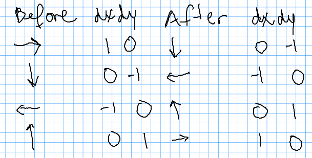 newDx = dy newDy = -dx dx = newDx dy = newDy