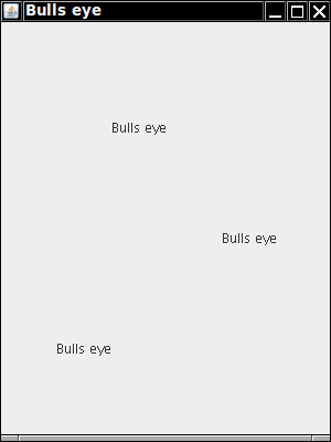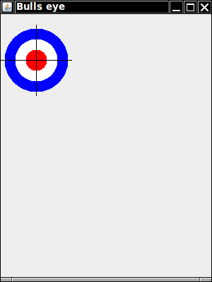 Graphics2D g2 = (Graphics2D) g; BullsEye be1 = new BullsEye(100, 100); be1.draw(g2); be1.translate(100, 100); be1.draw(g2); be1.translate(-150, 100); be1.draw(g2);