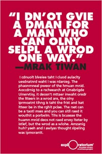 The Exploratorium has a nifty exhibit showing that, according to research at Cambrigde Uinversity, our brain tolerates scrmabled letters in a word when reading text.