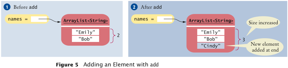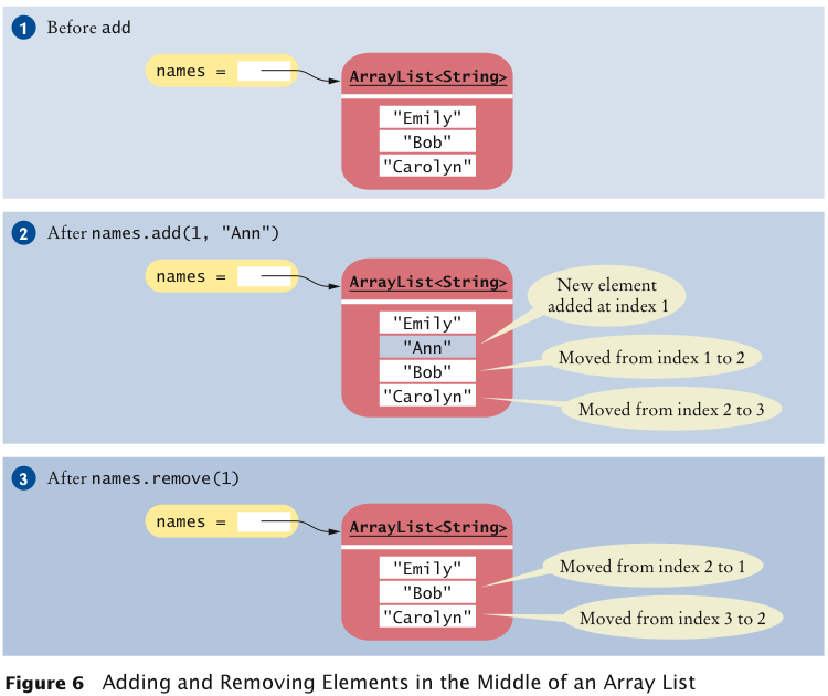Inserts an element at index 1. names is now [Ann, Bob, Cindy]. |