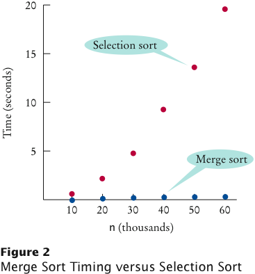 - With selection sort, the longer array takes 1,000,000 times as long, but with merge sort, it takes about 10,000 the same time as with the original array