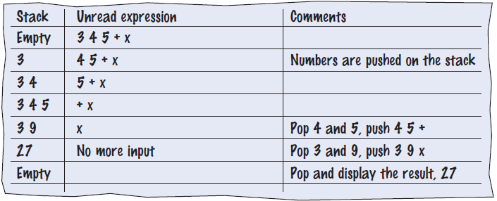 while more tokens t = next token if t is a number stk.push(t) else if t is an operand arg2 = stk.pop() arg1 = stk.pop() result = apply operand to arg1 and arg2... stk.push(result) print(stk.pop())