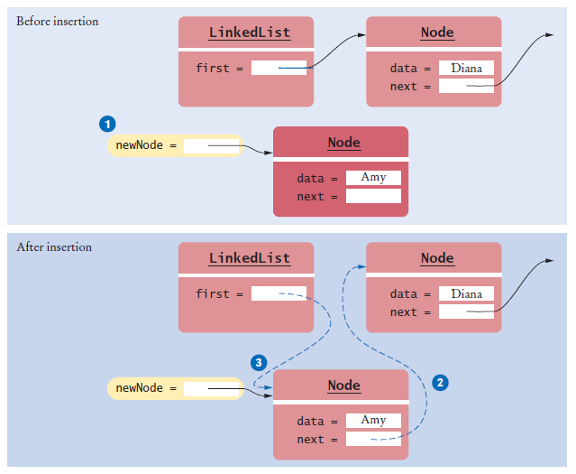 public void addFirst(Object element) { Node newNode = new Node(); newNode.data = element; newNode.next = first; first = newNode; }