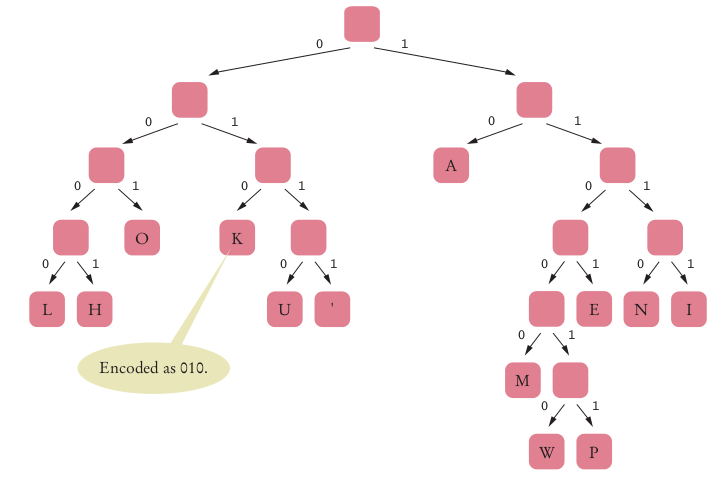 class Node implements Comparable<Node> { . . . public void fillEncodingMap(Map<Character, String> map, String prefix) { if (left == null) // It’s a leaf { map.put(character, prefix); } else { left.fillEncodingMap(map, prefix + "0"); right.fillEncodingMap(map, prefix + "1"); } } }