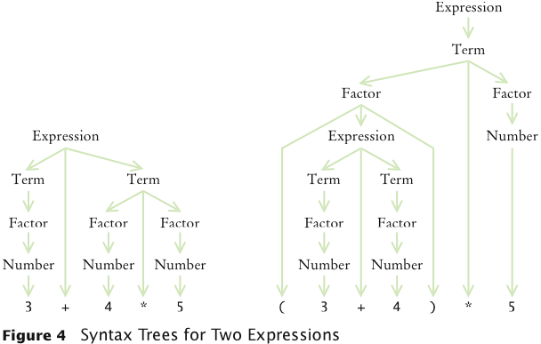 To see the mutual recursion clearly, trace through the expression (3+4)*5:
