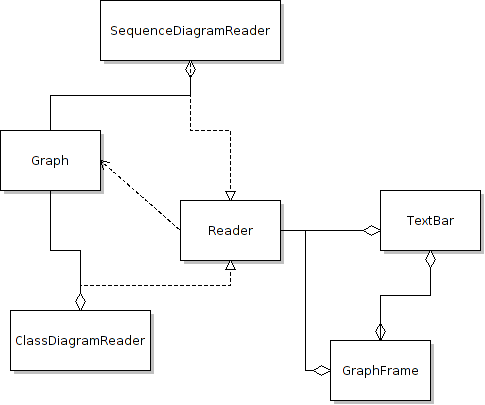 We create a Reader that executes some commands to create a Graph. The get method takes Graph as a parameter to construct the corresponding reader and return it. There is read() method which will take a string as a parameter and create a new graph based on the string. Then the read method will return the new Graph to TextBar. And let it handle the graph.