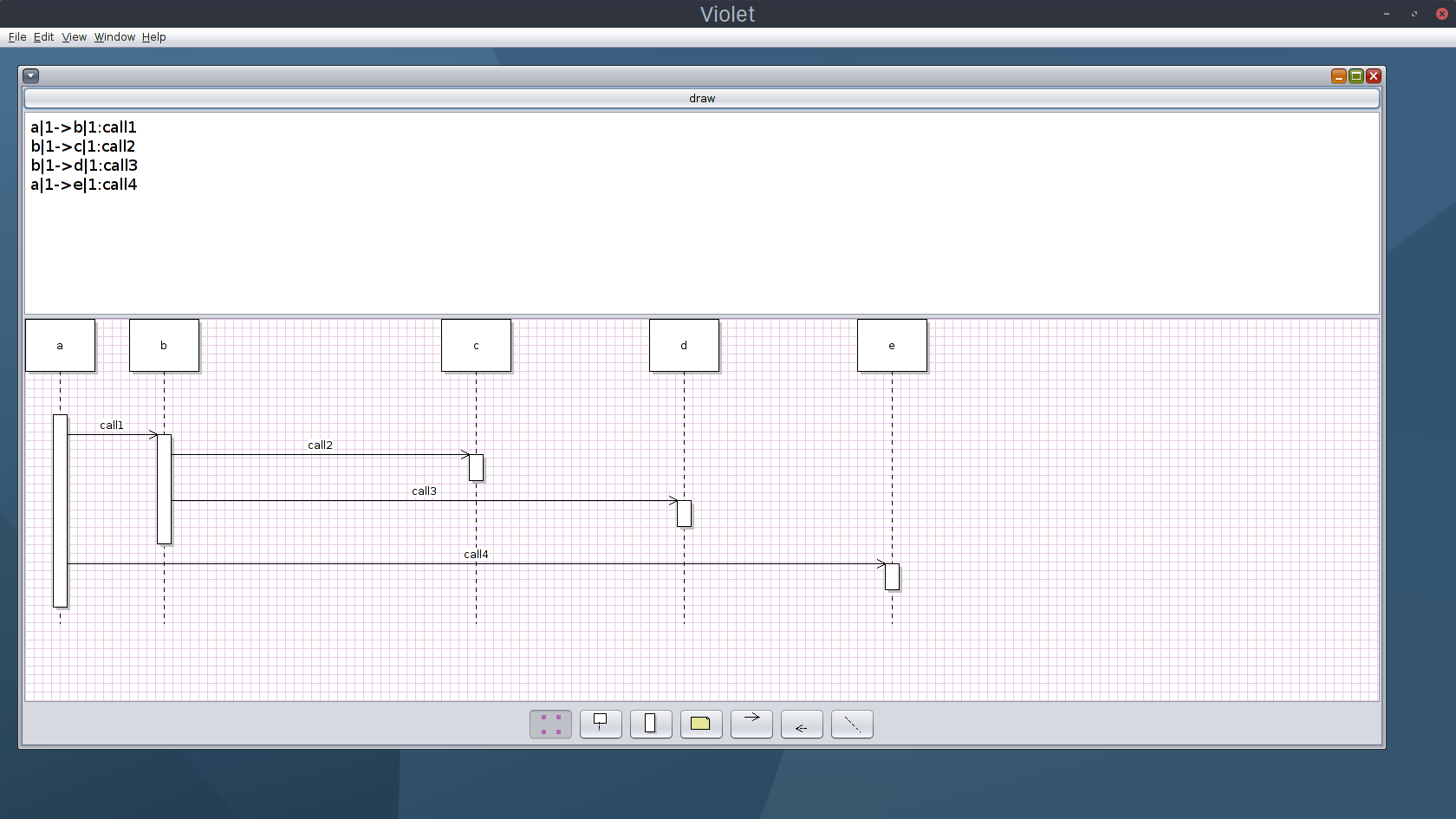 "className1"|"index1"->"className2"|"index2":"methodCall" The index after the '|' is the index of the method called on the timeline. Look at examples below for more explanation.The method call after the ':' is an optional parameter that will be placed above the connection line of the two nodes.