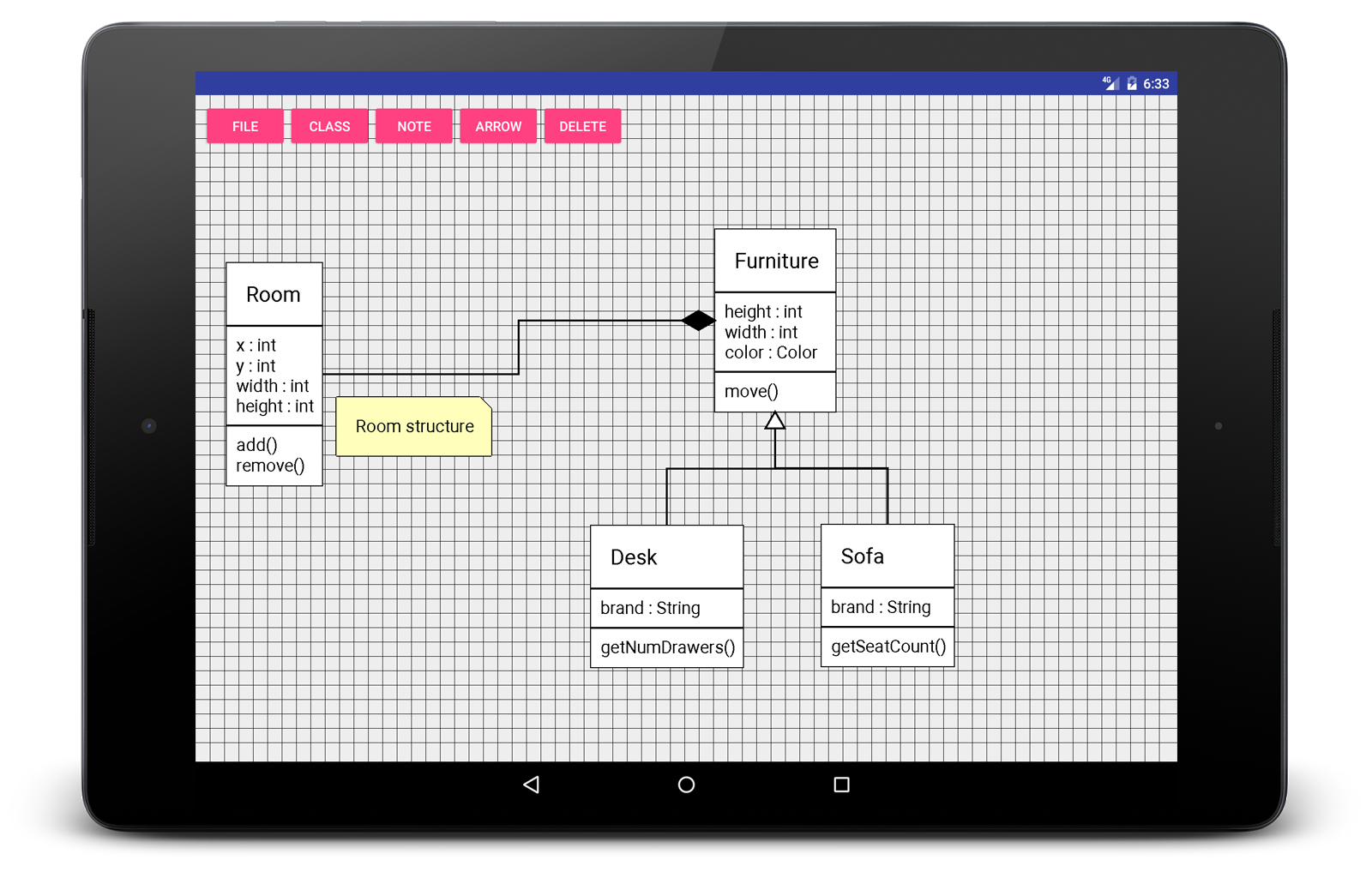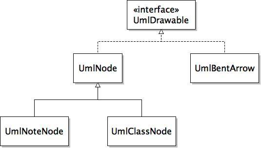 draw(): draw items in Canvas contains(): check if points lie inside UmlDrawable toJson(): returns JSON Object of UMLDrawable